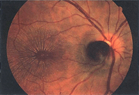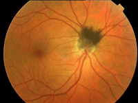 Figura 2. Melanocitoma macular sin afectación del nervio óptico. (Reproducida con permiso del Dr. I. Jürgens, publicada en Arch Ophthalmol. 1994).
