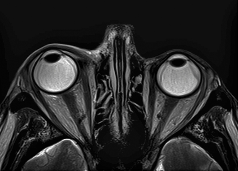 En los 3 días siguientes disminuyó la quemosis y se normalizó la PIO (12mmHg en AO) pero se observó estrechamiento progresivo de la cámara anterior llegando a grado I en AO (Figura 1). Al no existir bloqueo pupilar se orientó como un desplazamiento anterior del diafragma irido-lenticular en contexto de efusión ciliocoroidea por aumento de presión venosa epiescleral, confirmándose la presencia de pliegues coroideos y desprendimiento seroso de coroides periférico en AO (Figura 2 y Figura 3) con retinógrafo amidriático de campo ancho Optomap. Simultáneamente se realizó angio-resonancia nuclear magnética que descartó proceso infiltrativo orbitario localizado o patología de seno cavernoso, y que incidentalmente permitió visualizar el engrosamiento coroideo (Figura 4). Se añadieron ciclopentolato y dexametasona tópicos.