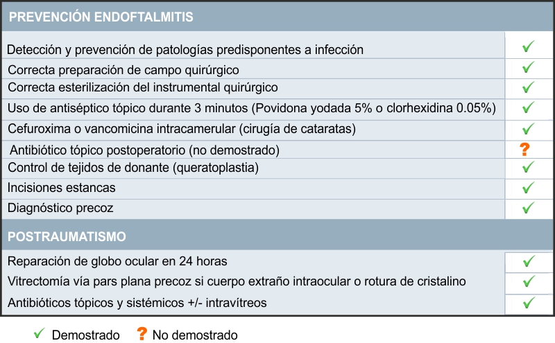 Existen varias causas predisponentes al desarrollo de una endoftalmitis. Dependiendo de si se trata de una cirugía ocular, un traumatismo ocular o una infección sistémica, se podrán emplear una serie de medidas para su prevención.4.1. Endoftalmitis postoperatoria