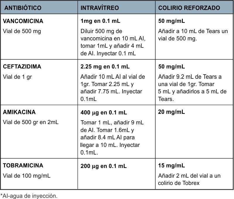 - Cefuroxima intracamerular. La única profilaxis antibiótica que ha demostrado ser efectiva en la reducción del riesgo de endoftalmitis postoperatoria es el empleo de cefuroxima intracamerular a dosis de 1 mg/0,1ml de solución salina al final de la cirugía de la cataratas11.