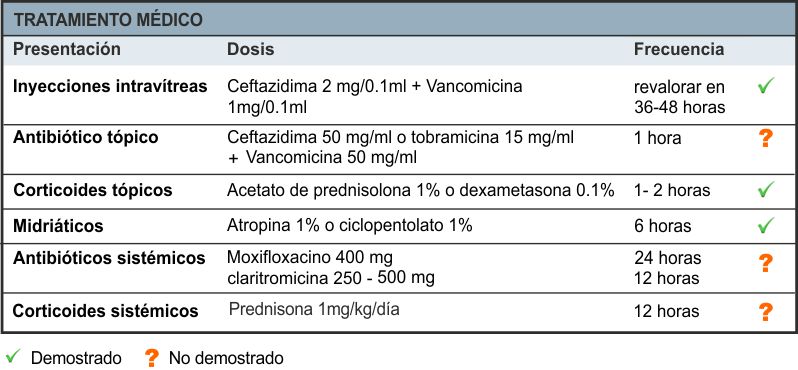 Ante la aparición de un cuadro inflamatorio severo en un periodo postoperatorio precoz, se debe iniciar tratamiento empírico como si se tratara de una endoftalmitis bacteriana y la evolución dará más datos de confirmación o de diagnóstico erróneo, pero se recomienda que cuanto antes se oriente como endoftalmitis infecciosa.