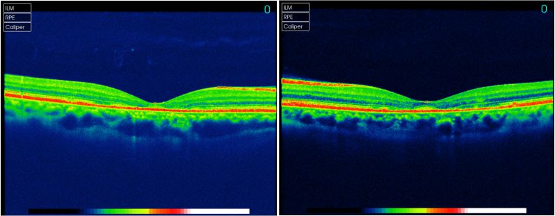 Figura 2. Tomografía de coherencia óptica. Atrofia foveal bilateral más pronunciada en el ojo derecho (imagen de la izquierda).