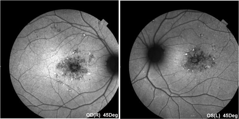 Figura 4. Autofluorescencia. Hipoautofluorescencia foveal bilateral por atrofia del epitelio pigmentario de la retina y puntos hiperautofluorescentes perifoveales.